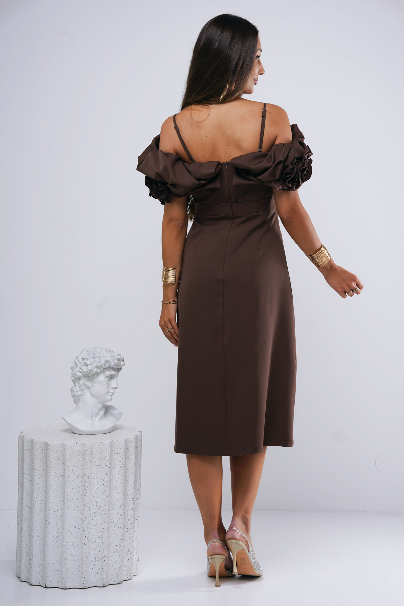SUKIENKA HISZPANKA Z RÓŻAMI OLIVIA MIDI BRĄZOWA