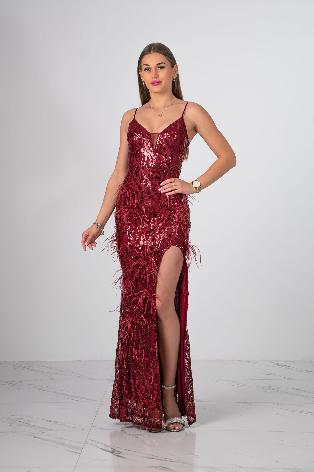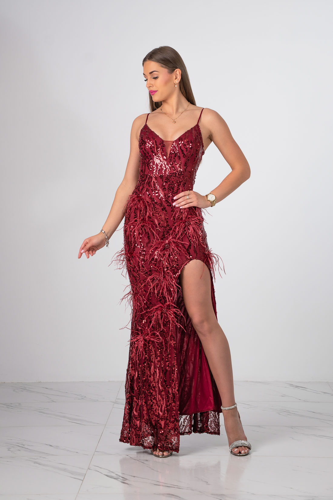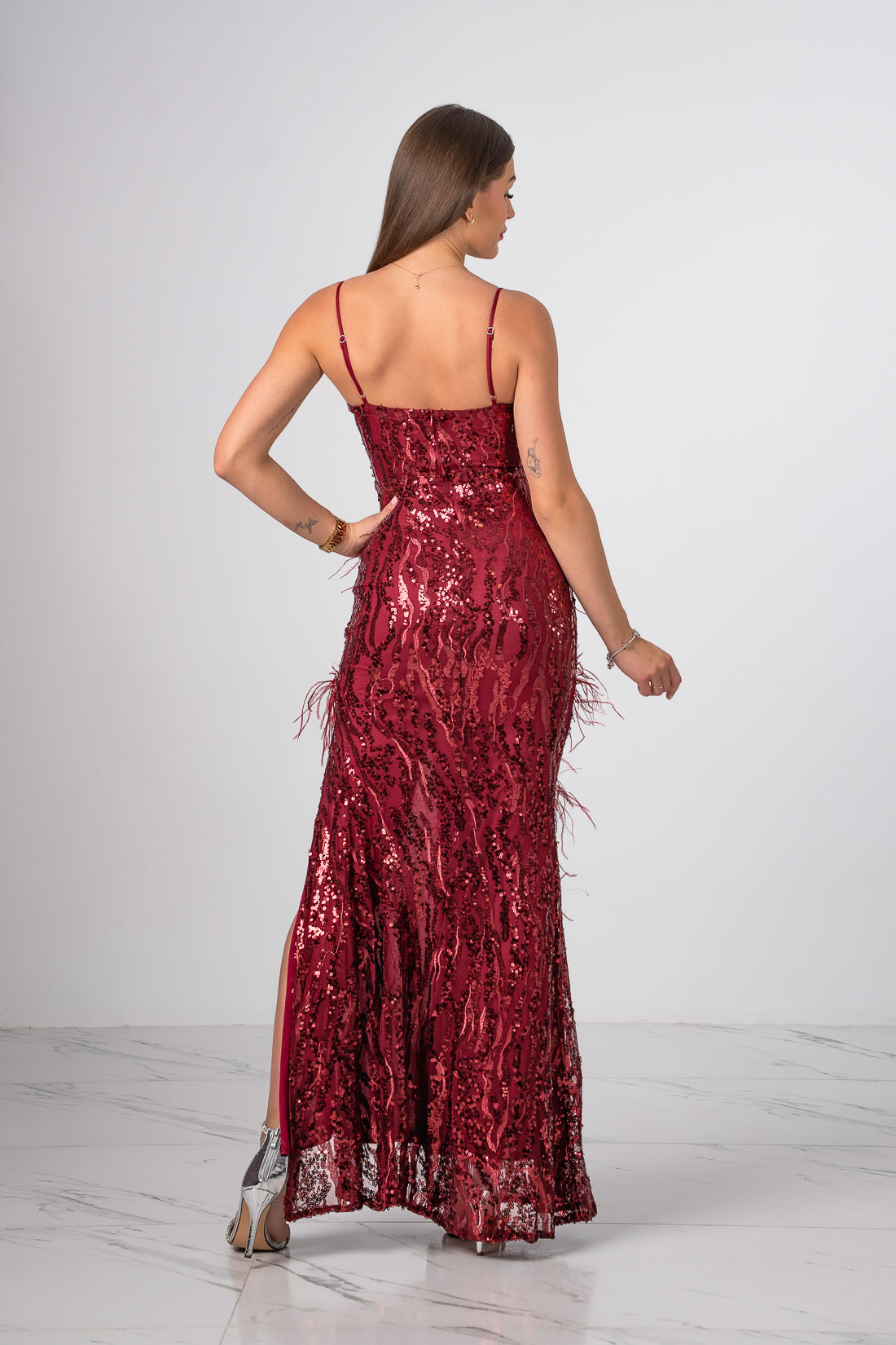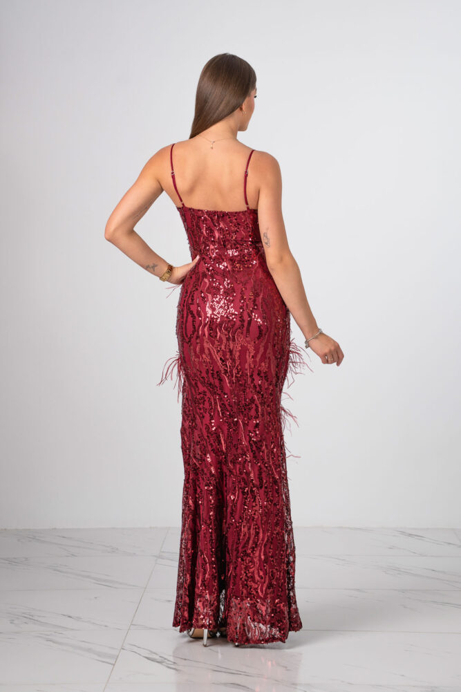 Niezwykła sukienka o długości maxi zdobiona cekinami oraz piórami z rozcięciem na nodze.