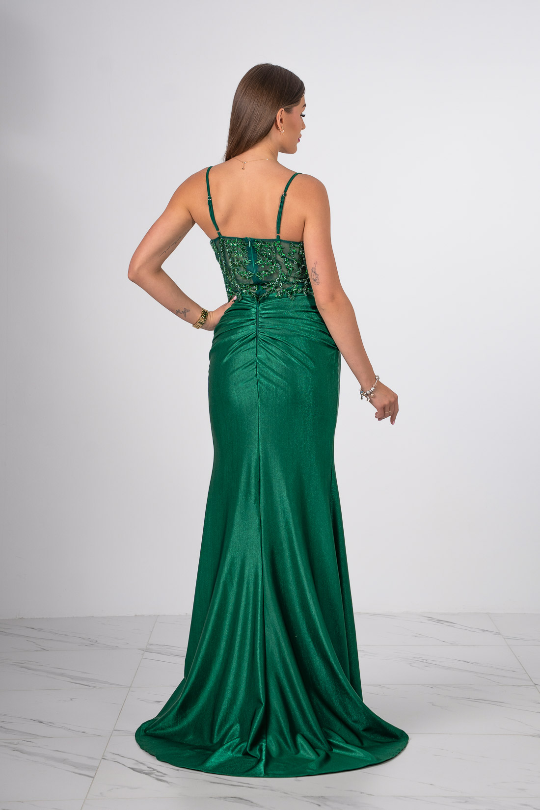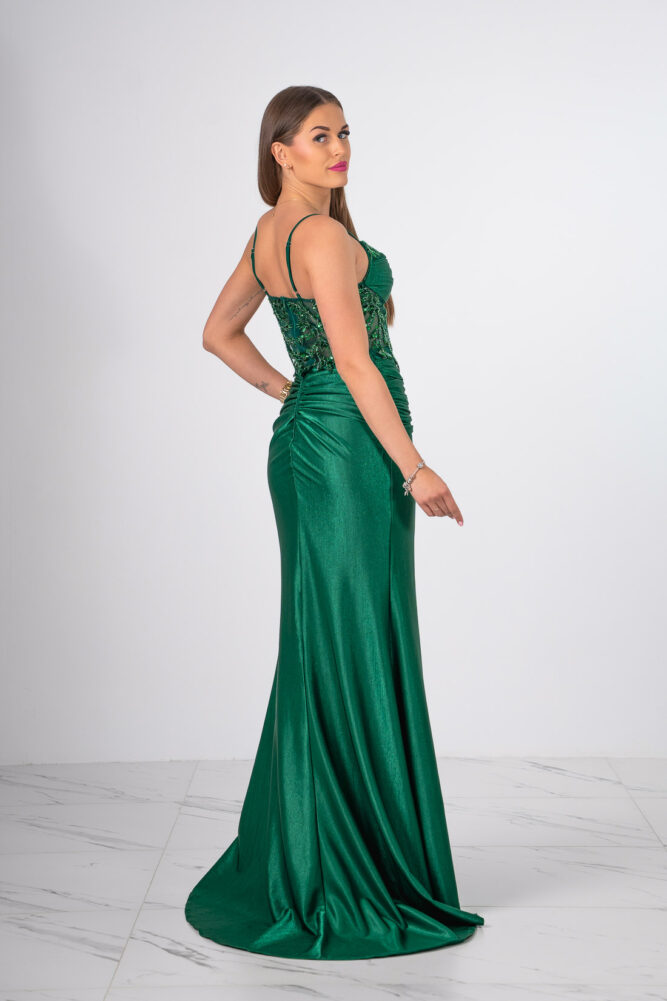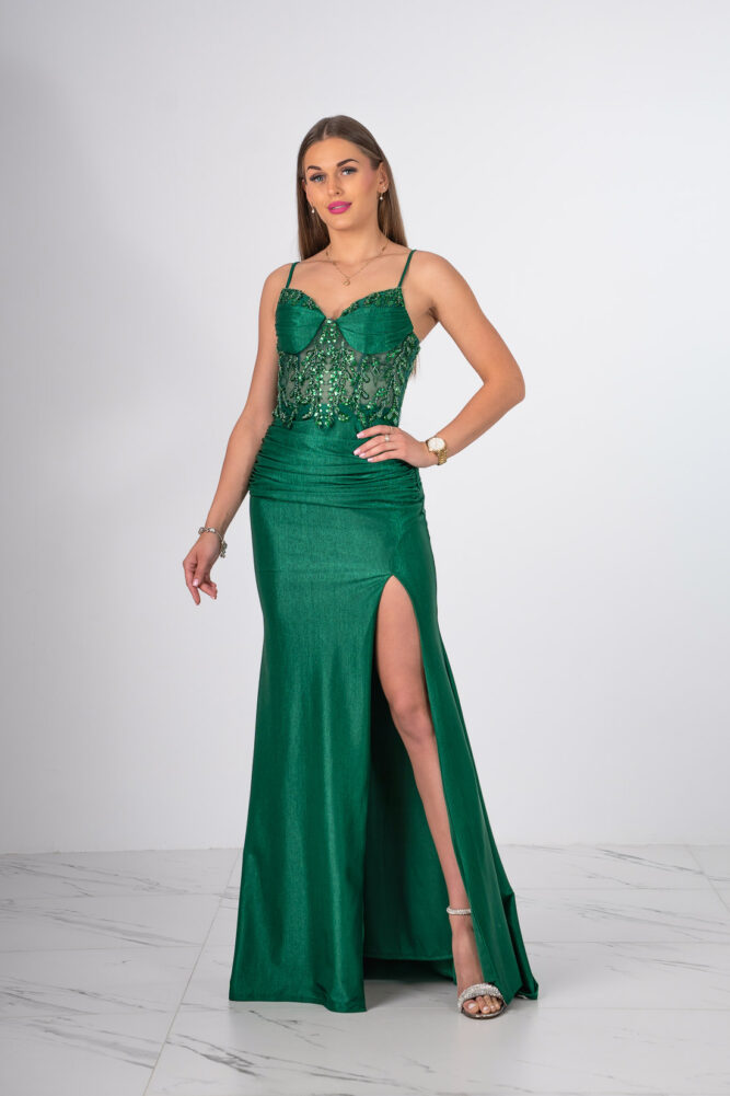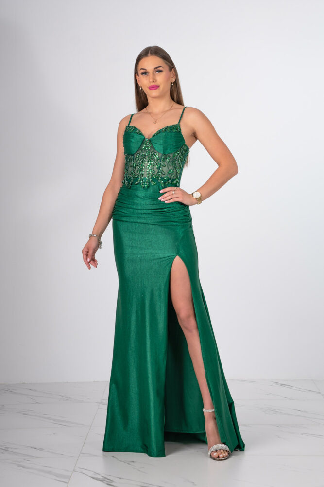 Niezwykła sukienka o długości maxi zdobiona cekinami  z rozcięciem na nodze.