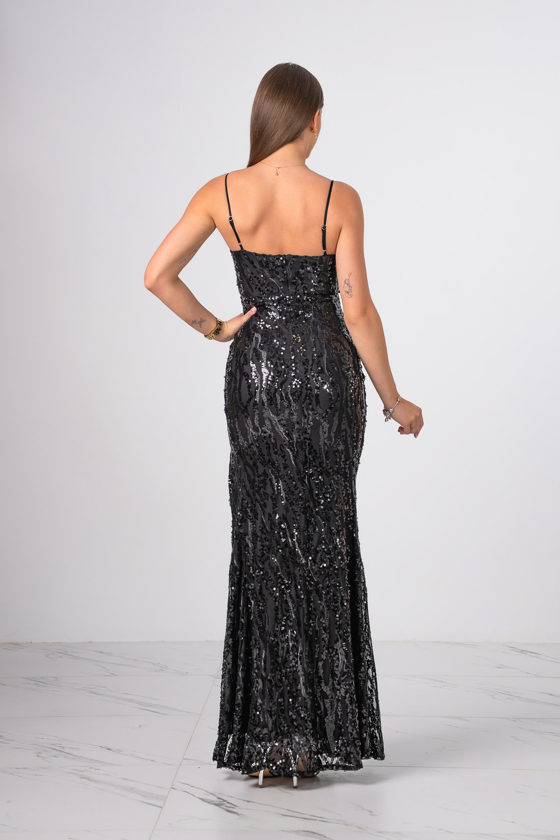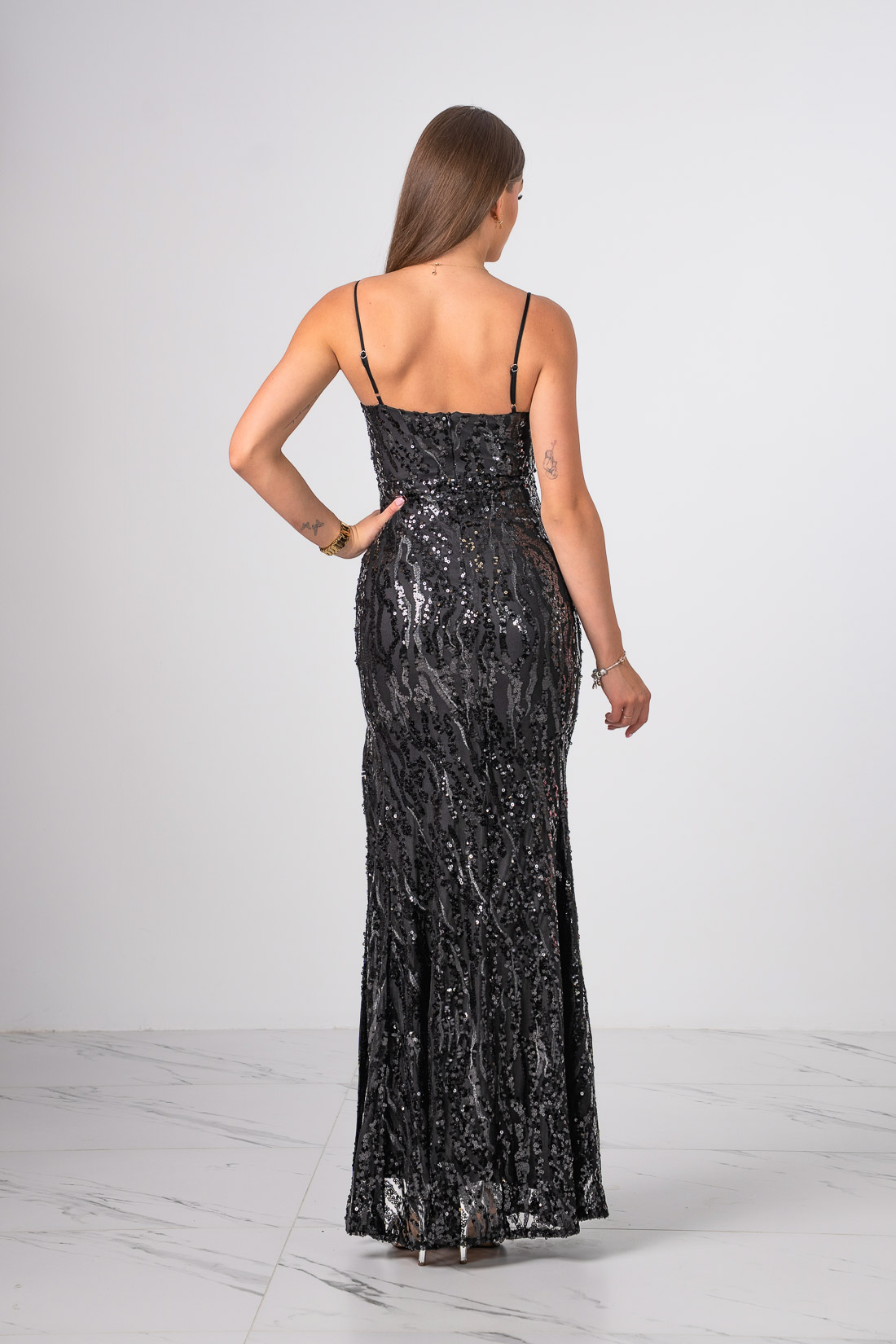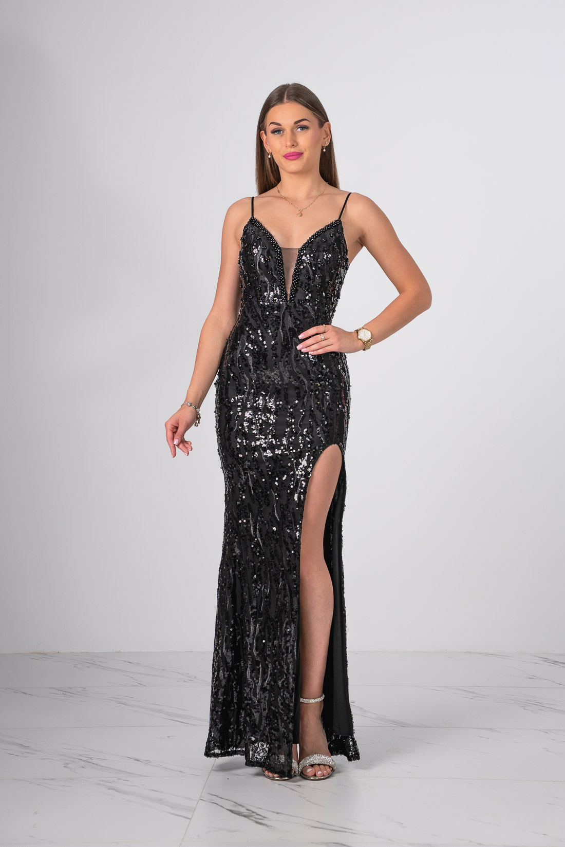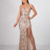 Niezwykła sukienka o długości maxi zdobiona cekinami  z rozcięciem na nodze.